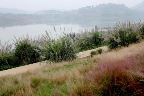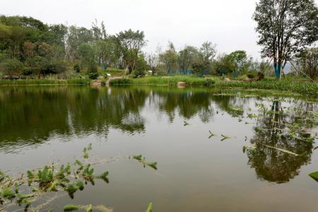 鴛鴦湖水從山上潺潺而來,溪流沿岸種植了適合本地生長的如蘆葦等水生植物,溪水在流動的過程中,被水生植物自然過濾凈化流入湖中。湖岸種植有多種水生植物,湖中投放有水生生物。水生生物和水生植物共同對湖水再次凈化,達到水綠湖清的效果。