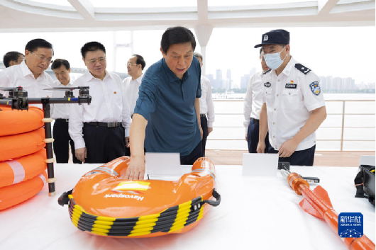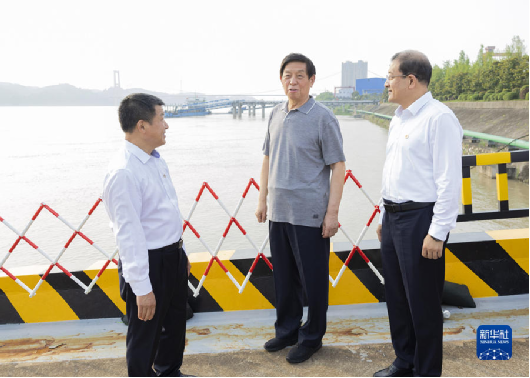 6月30日至7月4日,中共中央政治局常委、全國人大常委會委員長栗戰書率全國人大常委會執法檢查組在湖北檢查長江保護法實施情況。這是7月3日,栗戰書在漢口江灘碼頭考察長江大保護工作情況。新華社記者 黃敬文 攝