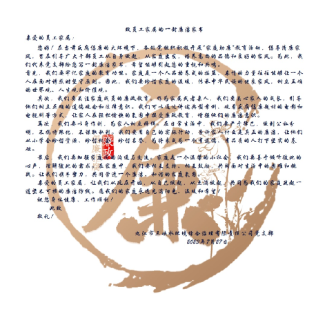 江西區(qū)域公司黨總支積極推進(jìn)廉潔文化陣地建設(shè),在辦公場(chǎng)所內(nèi)張貼廉潔文化宣傳海報(bào),組織員工開展廉潔文化作品創(chuàng)作,開展家庭助廉活動(dòng),通過(guò)向職工家屬發(fā)送廉潔家書、職工家屬向員工發(fā)送廉潔寄語(yǔ)等形式,積極打造廉潔從業(yè)“自律線”,不斷厚植企業(yè)廉潔文化土壤。