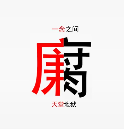 作品介紹:圍繞廉潔主題,將“廉”與“腐”字拼接并選用紅黑撞色形成強烈對比,表現其“一念之間,天堂地獄”的強烈反差,增強人的視覺感受。表達“廉潔”、“腐敗”只在人的一念之別,卻會有天堂地獄的不同結果。反腐倡廉應“常修為政之德,常思貪欲之害,常懷律己之心”,更應以廉潔敬畏之心,為企為民不觸碰腐敗紅線。