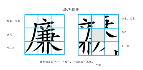 作品介紹:以華容道游戲為創作思路,廉潔拼圖分了9塊,上中下三層分別象征左側的“祖輩、父輩”“當代”“下一代”全部家庭成員,當家庭成員都心懷廉潔,堅守廉潔底線,整個廉潔拼圖才能拼成一個完整的“廉”字,才能真正的做到廉潔。傳承穩固需“廣”“兼”,一塊缺失不成廉。