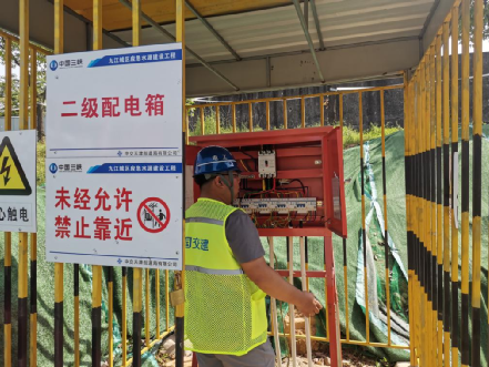 在九江二期城區應急水源建設工程施工現場,電工石朋頂著烈日仔細檢查二級配電箱的情況?!疤鞖庾儫崃?,檢查用電線路、設備要比平時更勤快,防止觸電危險。”常年奔走在施工現場,皮膚曬的黝黑,石朋憨厚的擦擦汗,說完繼續投入到工作中。