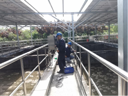 機修班長龐正舵、機修工戴繼勝正在檢修朱家橋污水處理廠廠區配電柜