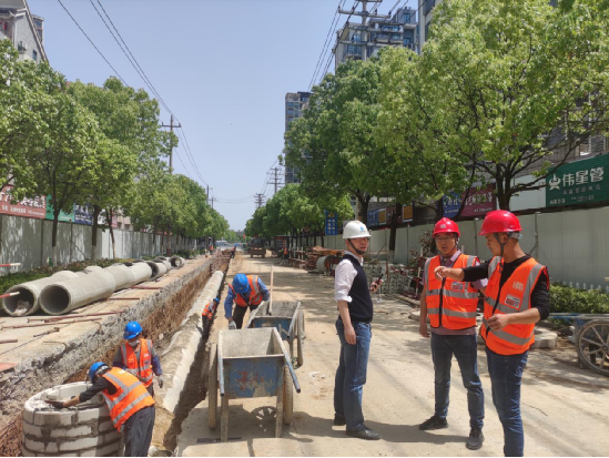 在繁昌項目馬仁山路雨污分流改造工程現場,工人們正在砌筑混凝土模塊檢查井,項目公司值班領導檢查現場施工的情況。